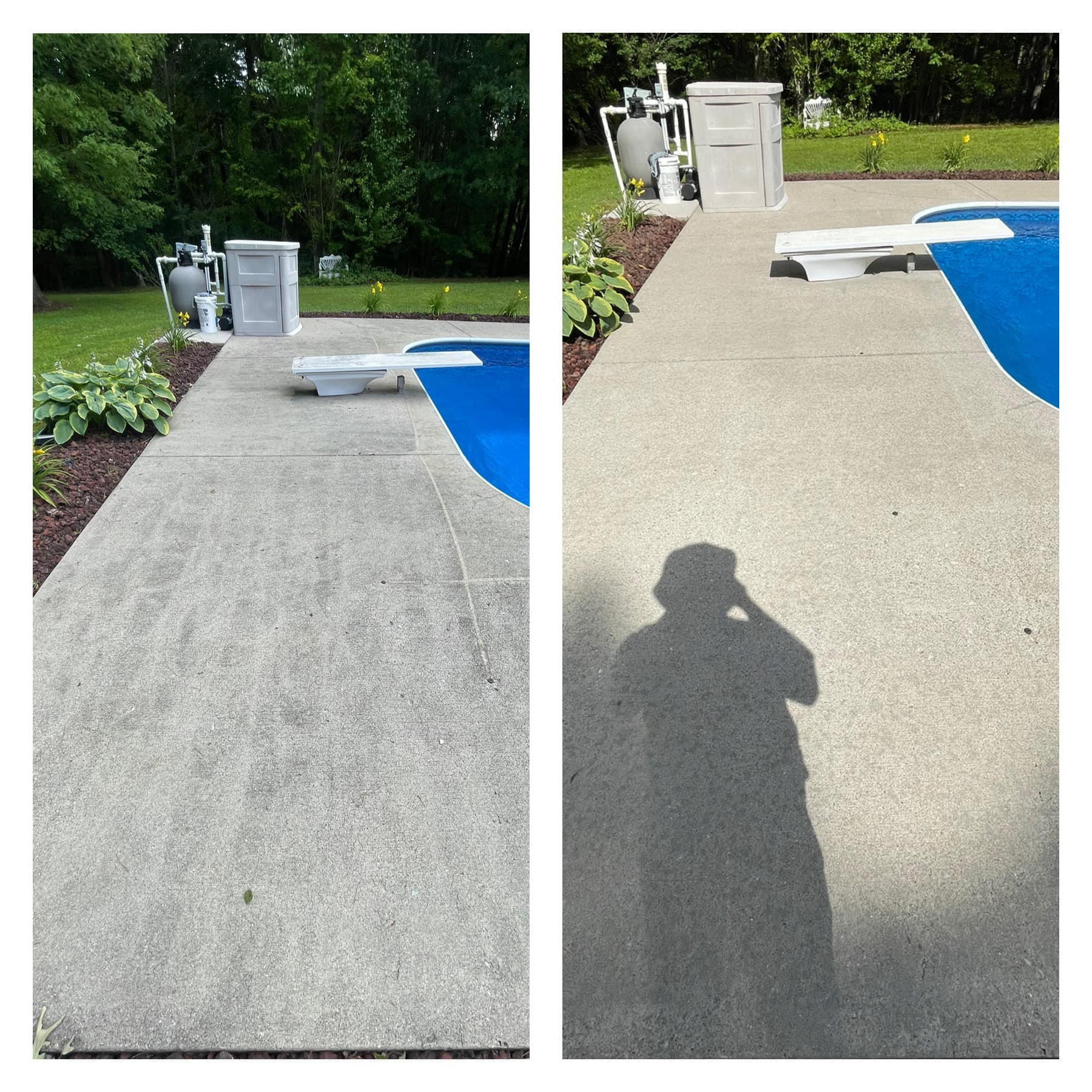 Gary from London, Kentucky reached out to us for pressure washing services to clean his pool patio concrete. He wanted the surface refreshed and ready for the season. Our crew scheduled the visit, arrived on time, and prepared the area so we could focus on restoring the concrete’s appearance without disturbing the surrounding patio furniture and pool accessories.