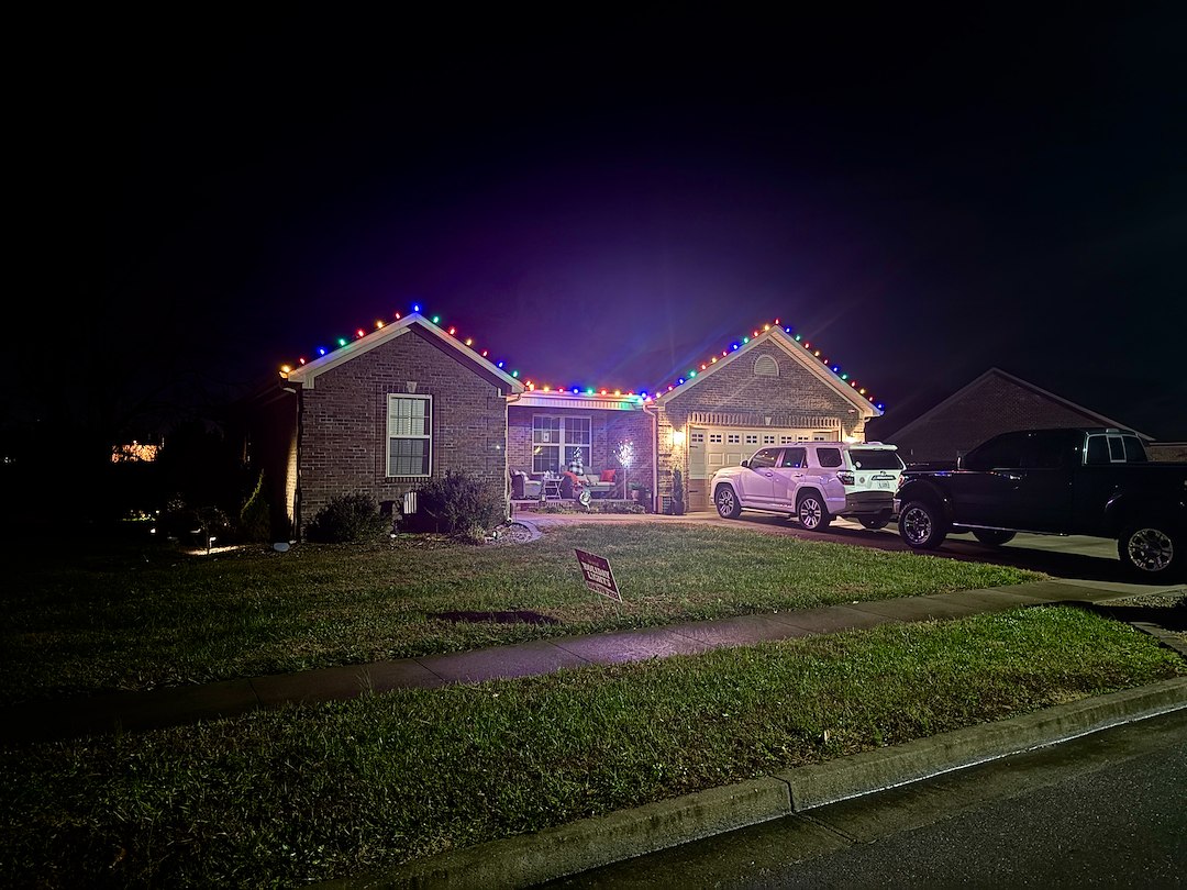 We recently completed a Christmas light installation for a returning customer in Berea, KY. This was our second year working at her home, and she asked for a color change in the display. Last year the house was lit with white lights, and this year she wanted a multi-color look instead.